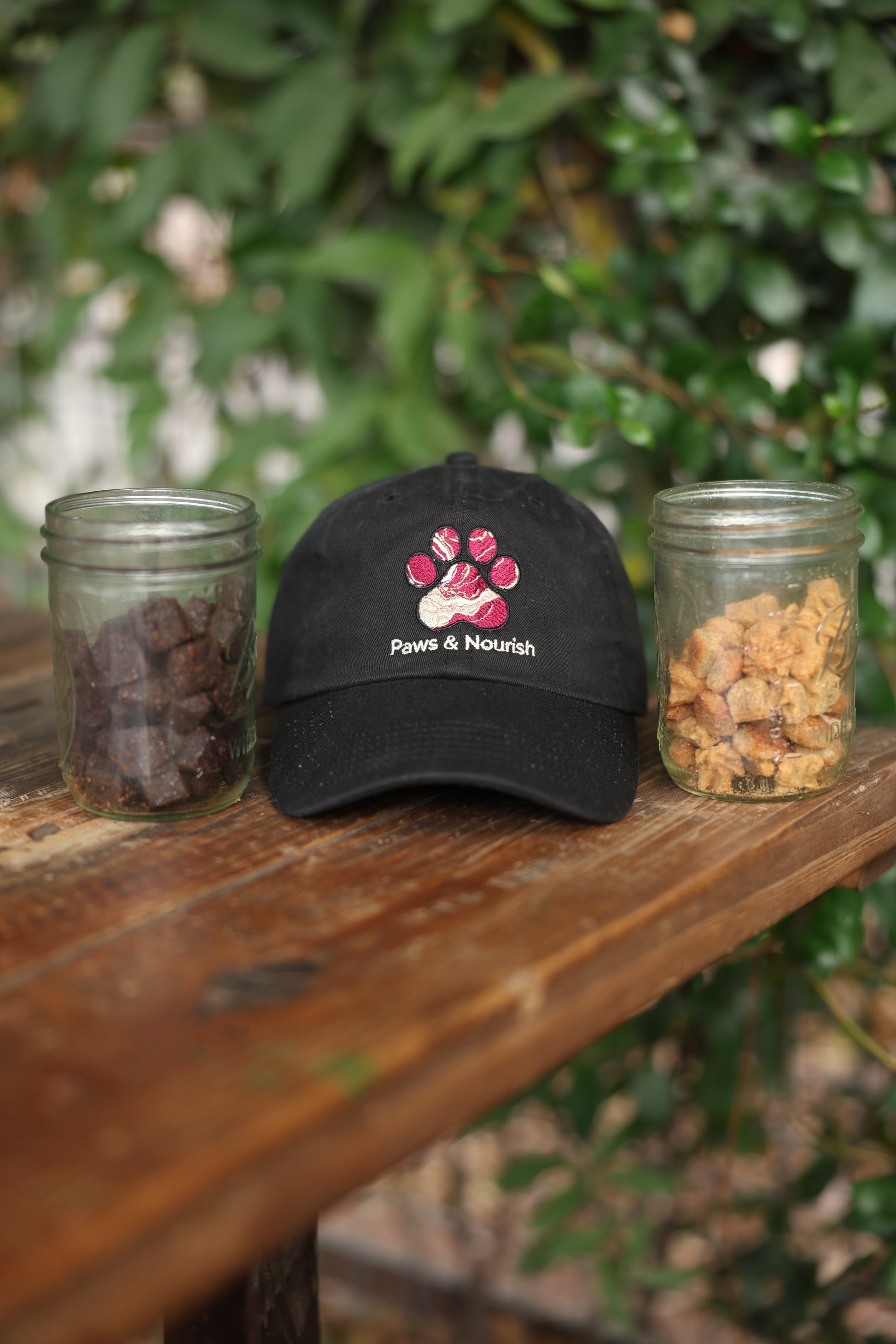 Show off your love for Paws & Nourish with our sleek black logo hat — a unisex staple designed for comfort, style, and sustainability. Each hat is carefully embroidered with our signature P&N logo in its classic colors: rich red/plum, warm gold, and soft cream.